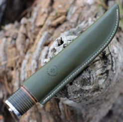 The Scandinavian Sportsman knife No.2 with a stainless steel blade in AEB-L and a stacked leather handle, also including the olive green leather sheath to match the knife.