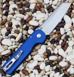Arcform Slimfoot Automatic (ARC-061) – 3.12″ 154CM Stonewash Sheepsfoot Blade, Blue Aluminum Handle