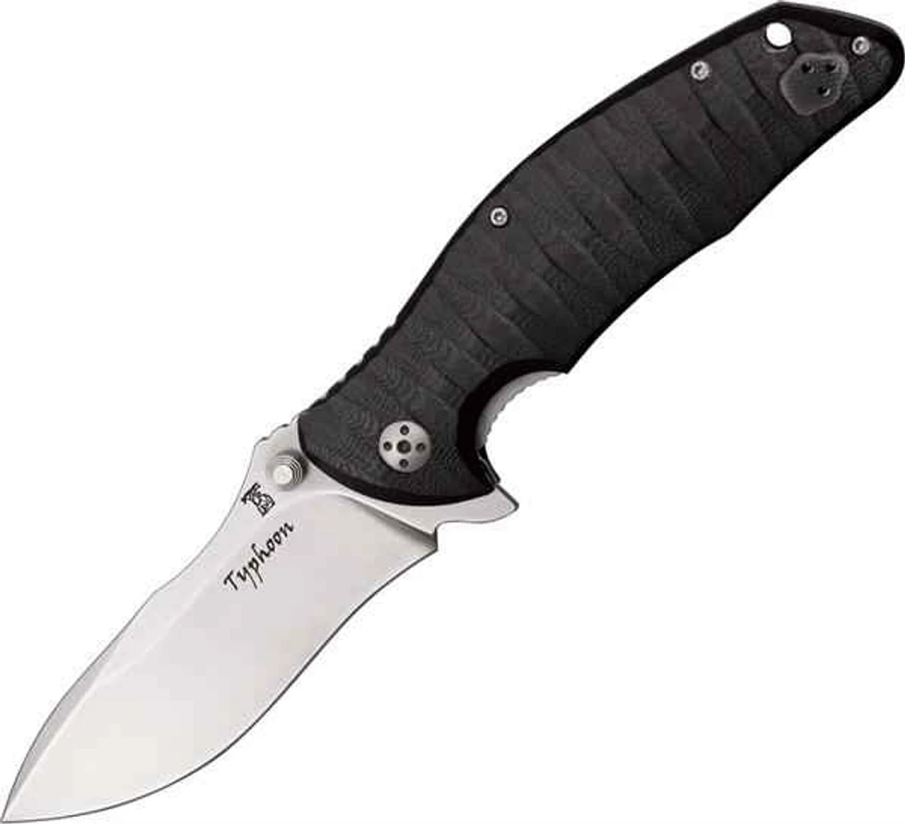 Dendra Typhoon. 8.85″ closed linerlock. 3.74″ D2 tool steel stonewash finish blade with dual thumb studs and extended tang. Hardened to 60-62 HRC. Black G-10 handles with 3D treatment. Lanyard hole. Stainless pocket clip. Made by Lion Steel